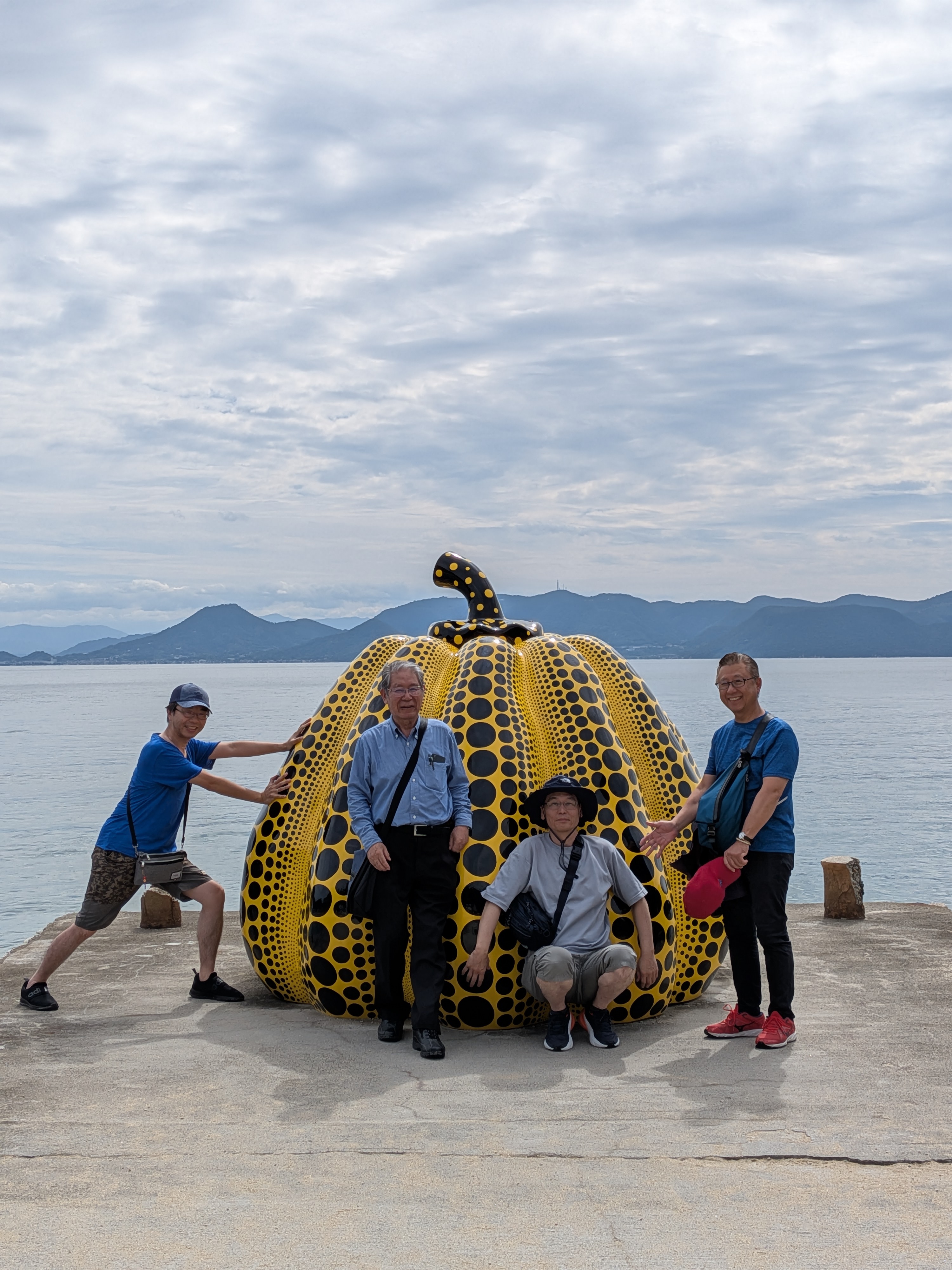 3日目は高速フェリーで“アートな島”直島へ渡り、赤かぼちゃオブジェ前にて記念撮影後、安藤忠雄氏の設計により今年5月にオープンした新直島美術館を鑑賞しました。